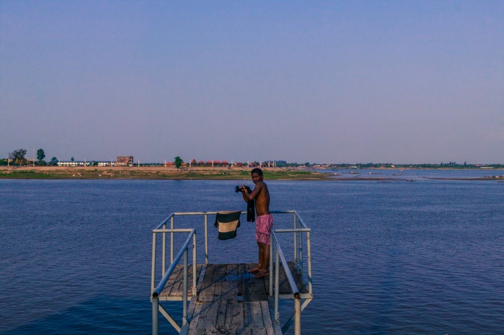 A Cambodian drying his clothes at the river side in Phnom Penh, Cambodia