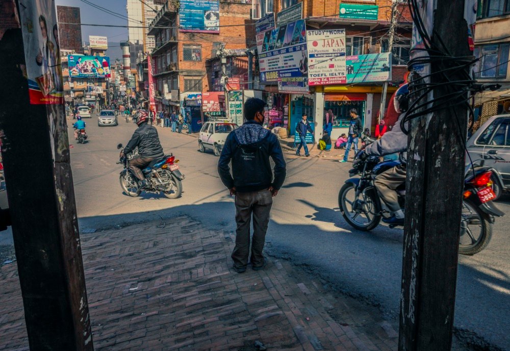 A Nepali man at standing at an intersection in Kathmandu, Nepal.