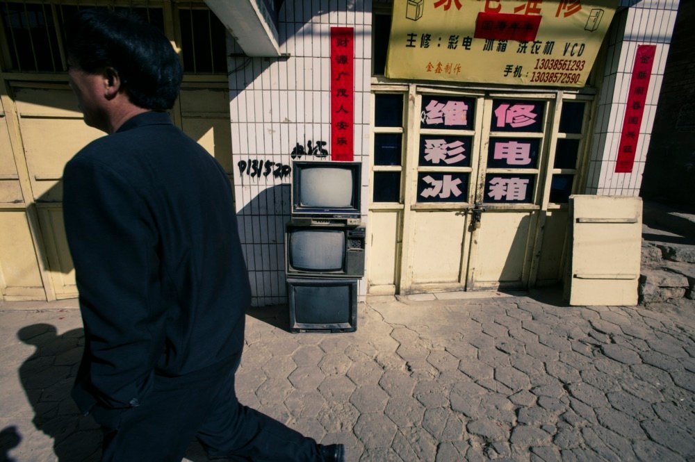 A Chinese man walking by a TV repair shop in Shanxi, China.
