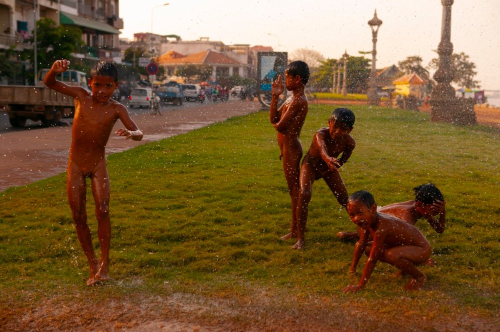 A group of Cambodian boys playing with water in Phnom Penh, Cambodia.