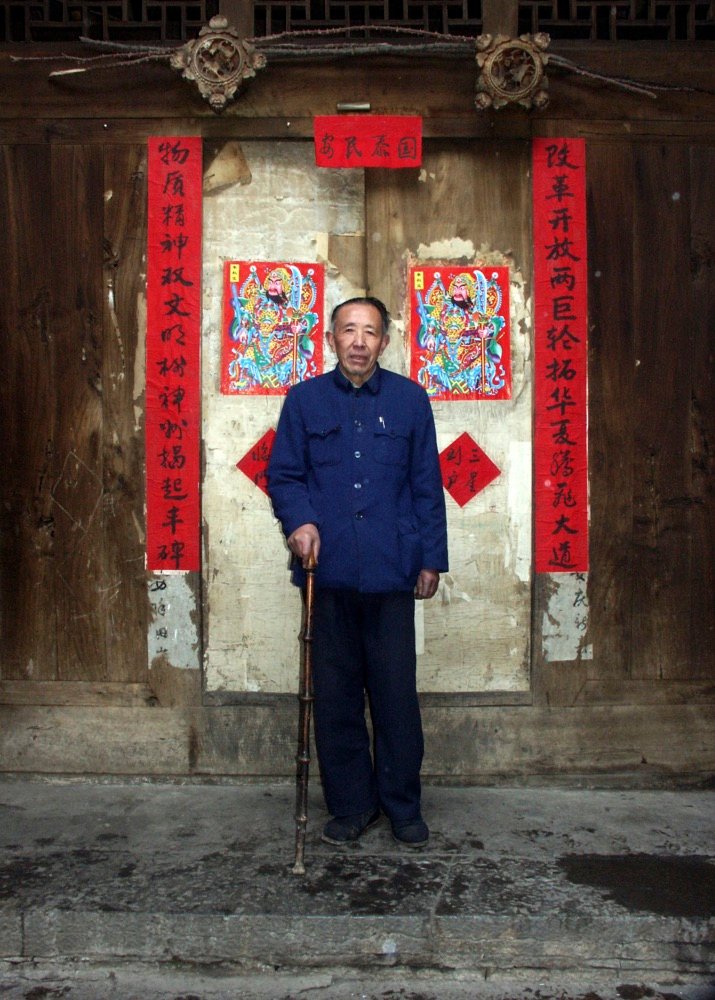 Portrait of a Chinese senior citizen at the doorway of a village house in Guizhou, China.