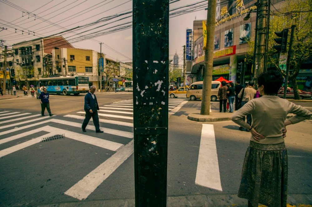 A Chinese woman waiting to cross the intersection in Shanghai, China.