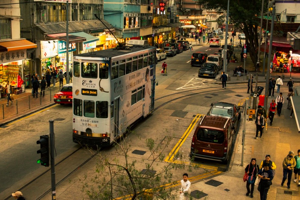 The Hong Kong Tram with nickname Ding Ding runs on Hong Kong Island between Kennedy Town and Shau Kei Wan, with a branch circulating through Happy Valley.