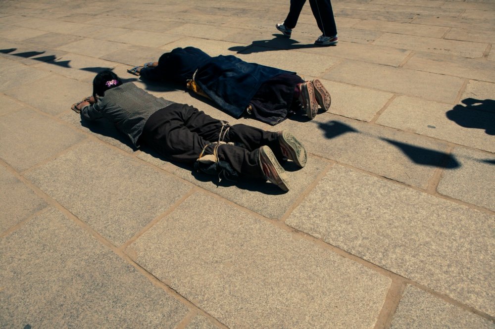Tibetan pilgrims perform full-body prostrations to accumulate merit at Jokhang Monastery in Lhasa.