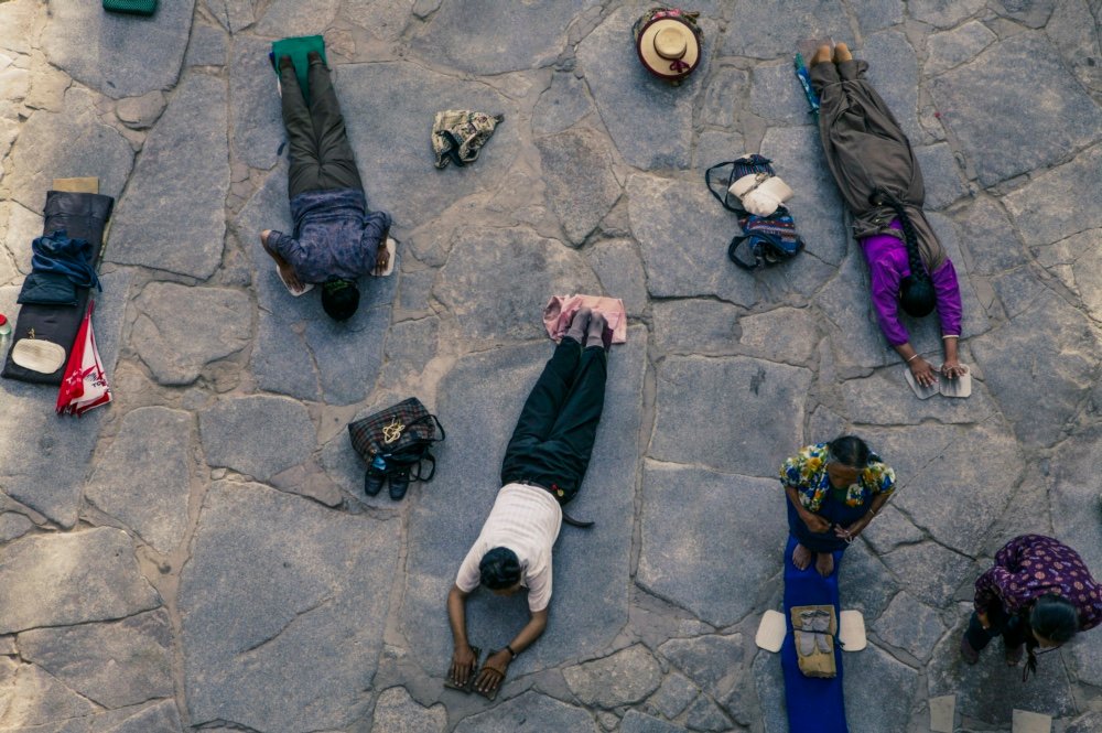 Tibetan pilgrims perform full-body prostrations to accumulate merit at Jokhang Monastery in Lhasa.