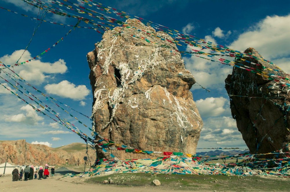 There are Tibetan prayer flags hanging between the rocks at the Namtso Lake. It is a tradition that Tibetan prayer flags are hung on high places like passes and temples.