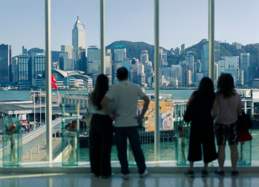 Couple of tourists overlooking Victoria Harbor in a shopping mall in Tsim Sha Tsui, Hong Kong.