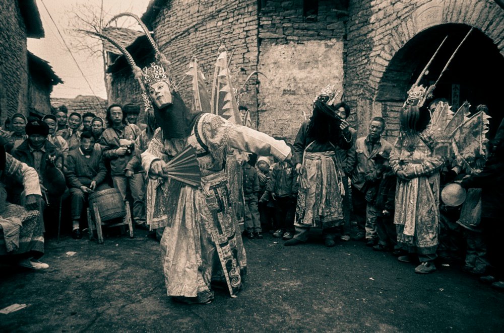 . Performed by villagers on open ground during the Spring Festival, actors wear elaborate wooden masks on their foreheads to honor ancestors and ward off evil.