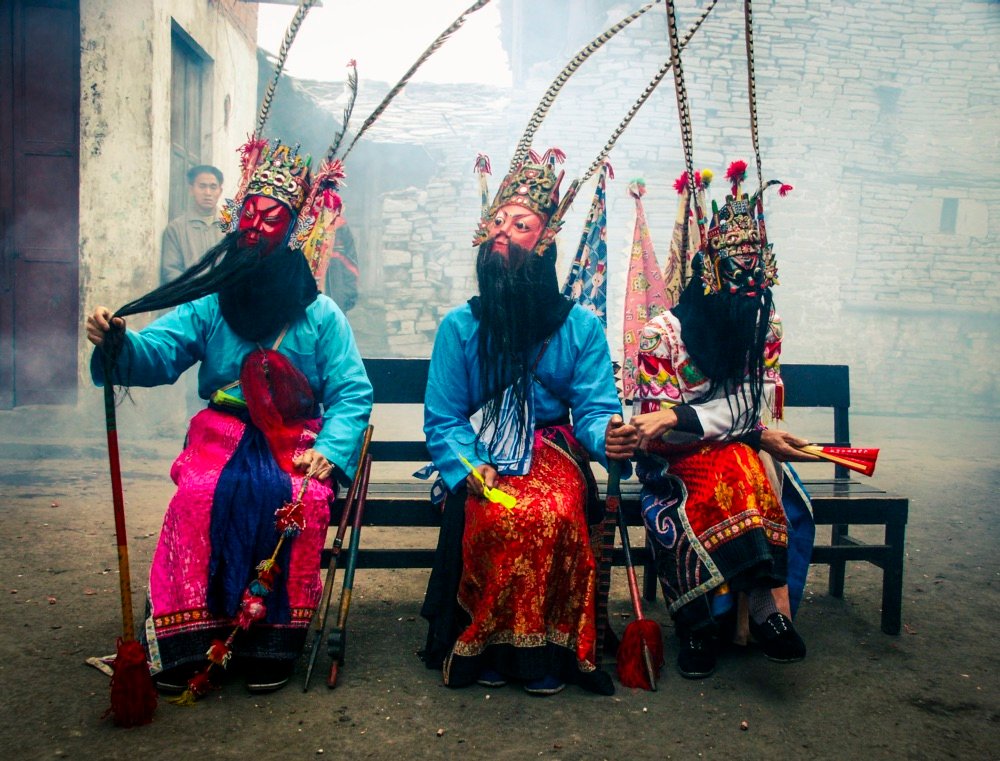 . Performed by villagers on open ground during the Spring Festival, actors wear elaborate wooden masks on their foreheads to honor ancestors and ward off evil.