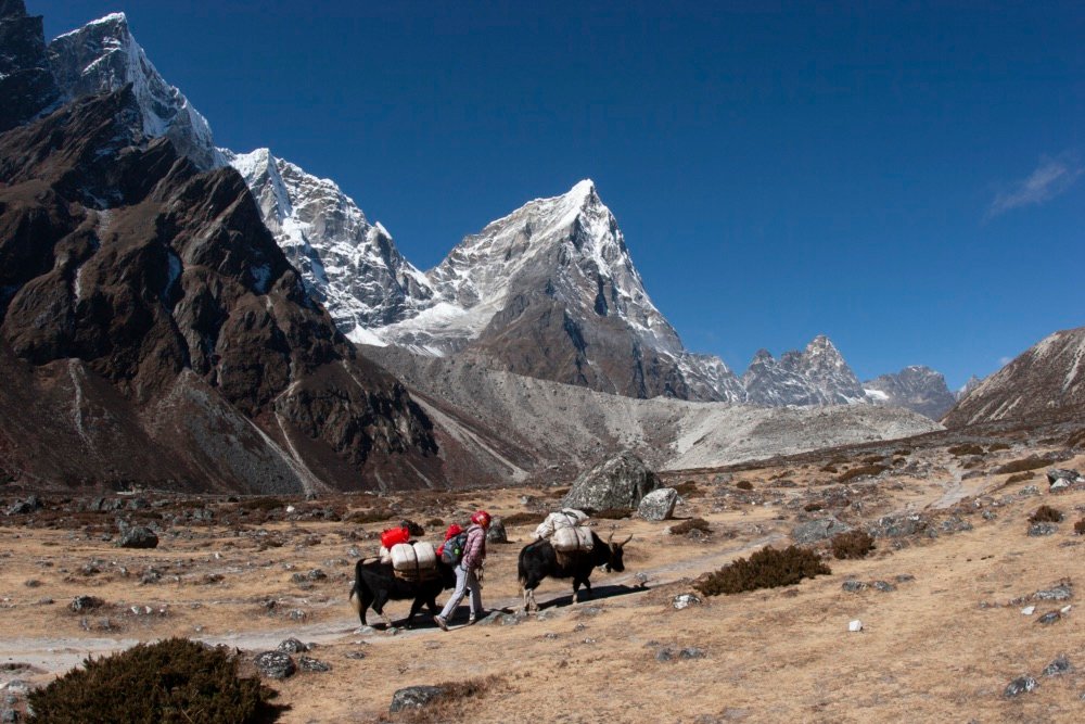 Yaks carrying goods at Everest Base Camp Trek in Nepal Himalayas. Yaks are the “backbone” of logistics for the Everest Base Camp trek in Nepal’s Khumbu region. As there are no motor-able roads in Sagarmatha National Park, these sure-footed animals are the primary means of transporting everything from food and fuel to medical supplies and trekking gear.